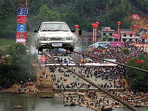 Китайский каскадер сумел выполнить очень опасный трюк – он проехал на стандартной машине по двум тросам, которые были натянуты над пропастью на высоте 45 метров!